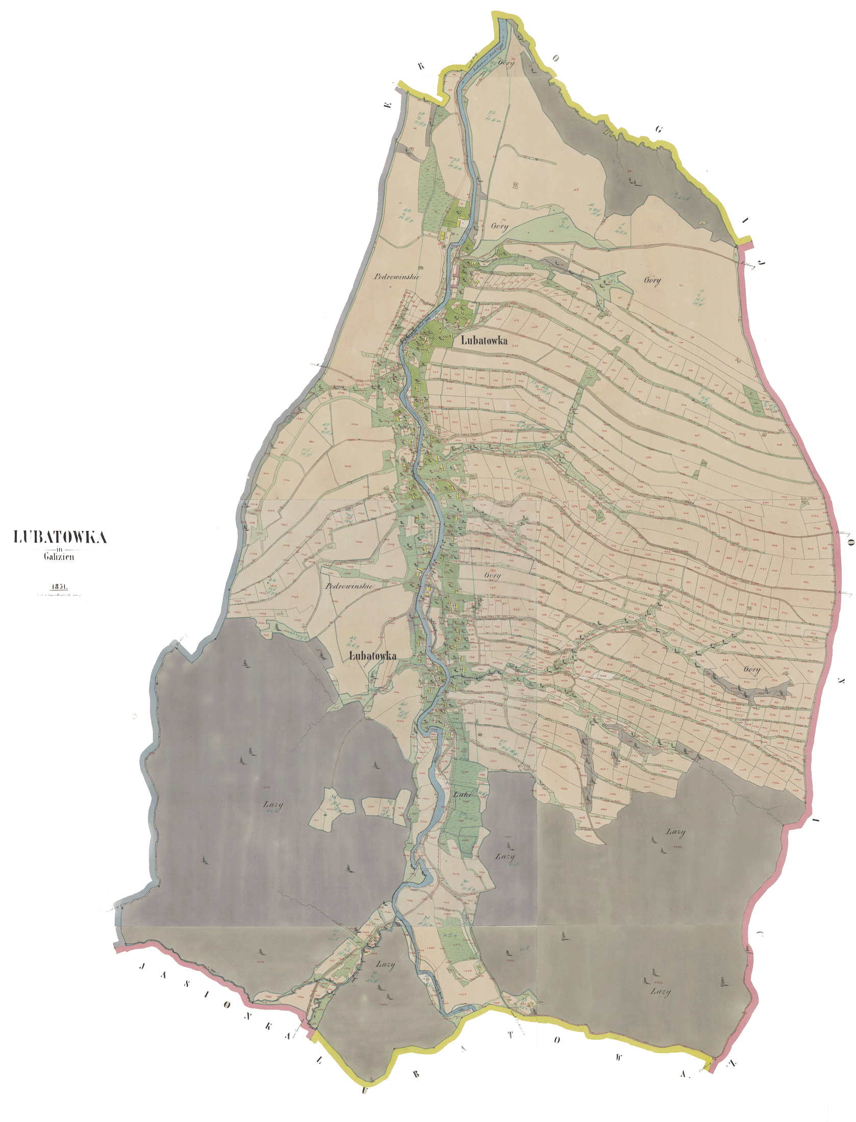 Ale lepiej jak to zrobicie ze mną na przykładzie. Nie mam żadnych przodków z Galicji więc muszę wyjść od mapy. Wy natomiast możecie wyjść od swojego przodka. Ja robię to od końca. Losowo wybieram mapę. Lubatówka, pokazuje 10 skanów, a w rzeczywistości jest 6 + pierwsza strona ze skorowidzem. Mapa jest podzielona na 6 arkuszy części. Po scaleniu wygląda czytelniej. Jeśli jesteś zainteresowany usługą scalania mapy katastalnej – napisz.