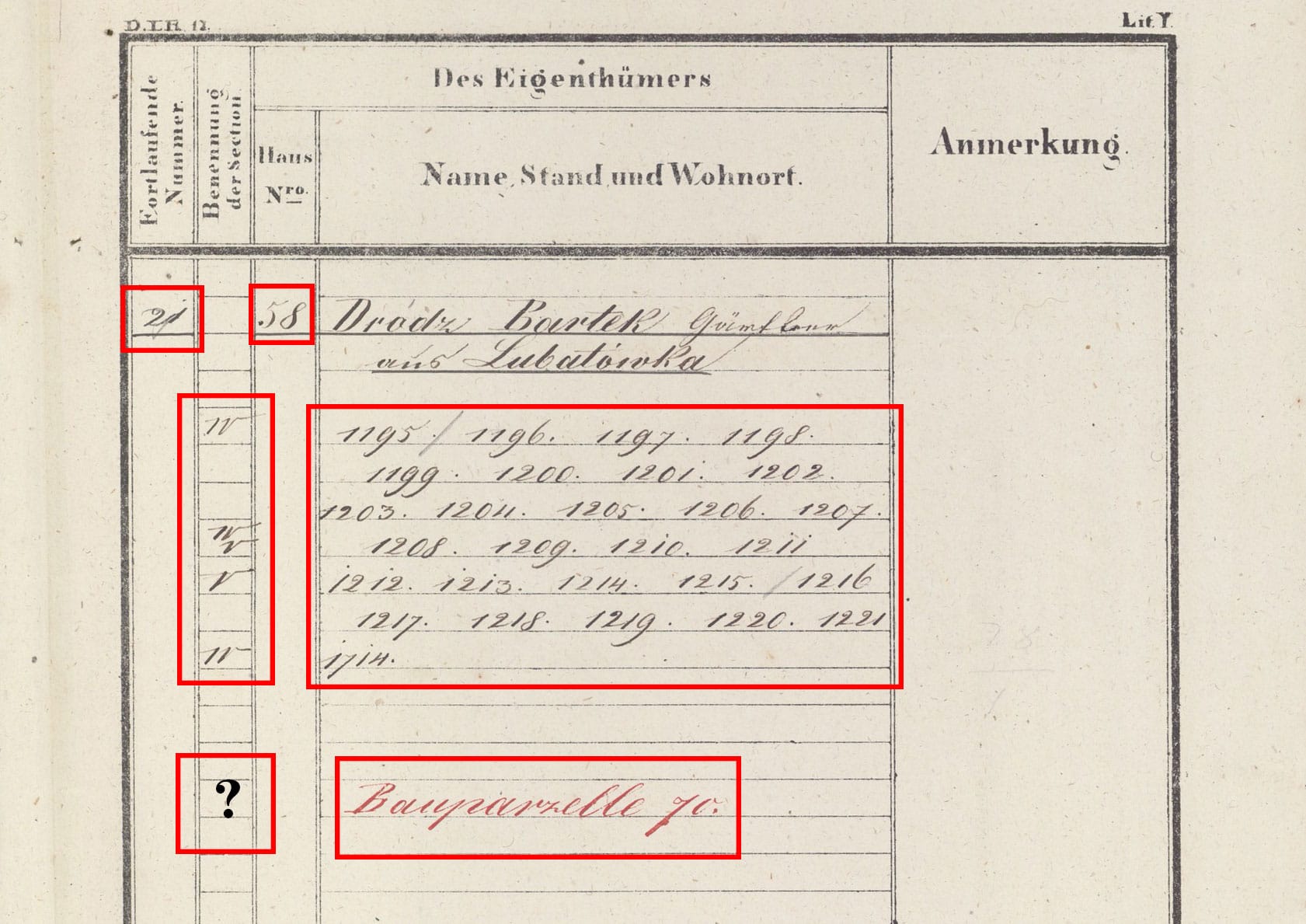 Co możemy znaleźć na tych mapach? Parcele gruntowe numery z kolorem czerwonym, parcele budowlane żółte z czarną numeracją. Link do legendy, zaznaczę jednak, że nie była dedykowana Galicji, bo pochodzi z 1824, więc może się znacznie różnić. Zamieszczam w opisie. Jednak sama mapa może nam mało powiedzieć. Potrzebujemy jeszcze tzw. operatu.