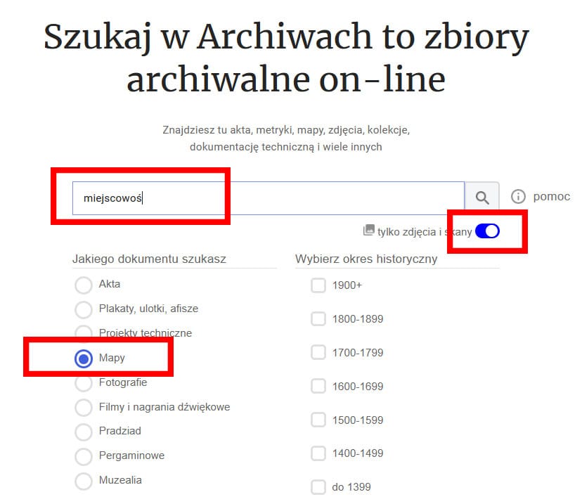 Wejdźmy zatem tam gdzie można mapy odnaleźć. Szukaj w archiwach. Klikamy w pole szukania wybieramy w filtrach mapy, zaznaczmy opcję tylko zdjęcia/skany wpisujemy swoją miejscowość. Ją polecam wpisać bez polskich znaków diakrytycznych i w różnych wariantach, po polsku i niemiecku. Wszystkie mapy z katastralne mają w tytule “galizien” więc jak wpiszesz miejscowość+galizien znajdziesz mapy katastralne od razu.